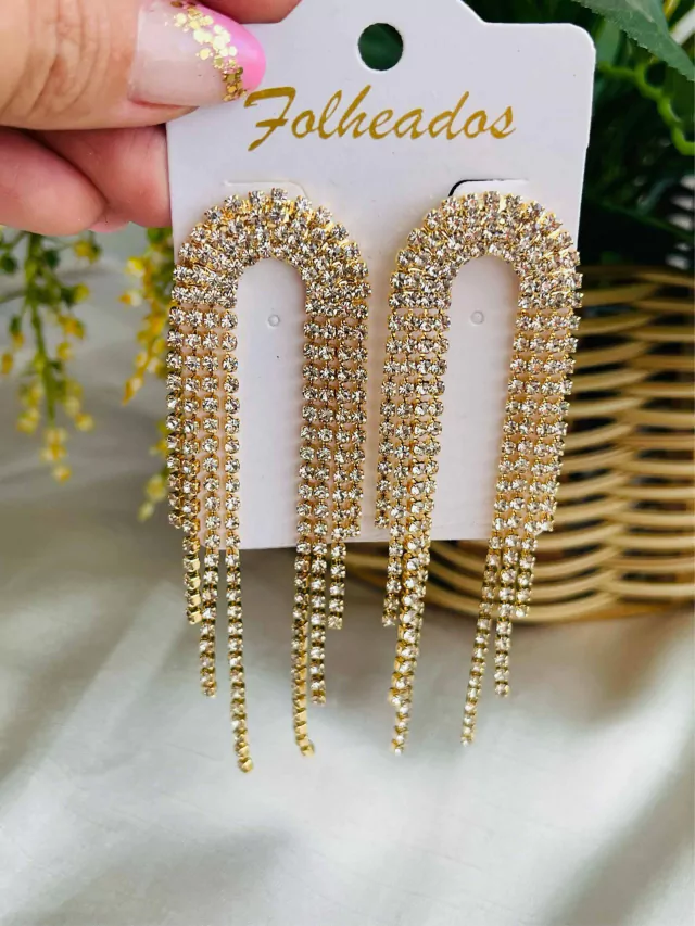 Brinco de Strass Arco Cascata Folheado a Ouro 18K