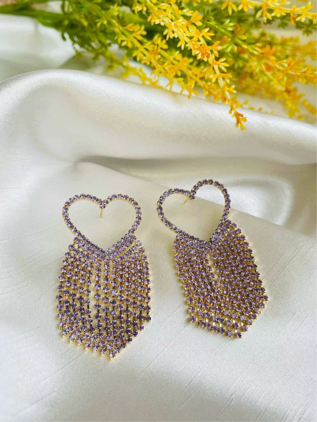 Brinco de Strass Coração Lilás Folheado a Ouro 18K