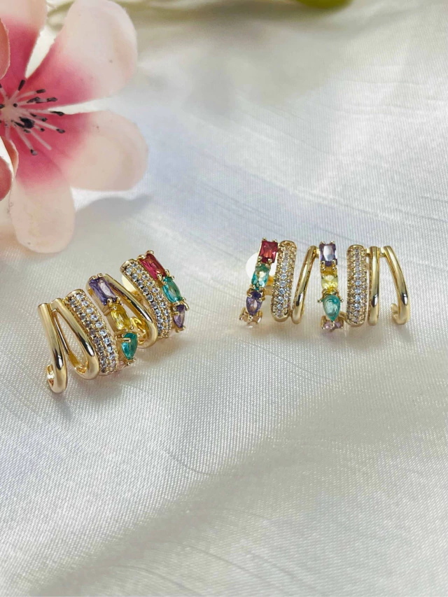 Brinco Zig Zag Cravejado Colorido Folheado a Ouro 18K