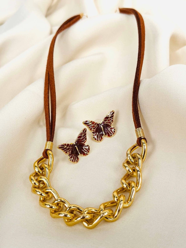 Colar Couro Marrom e Corrente com Brinco Borboleta Marrom