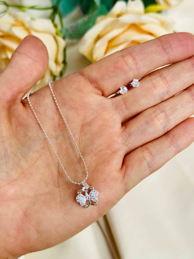 Kit Colar Bolinhas e Borboletinha com Brinco de Zircônia Folheado a Prata 925