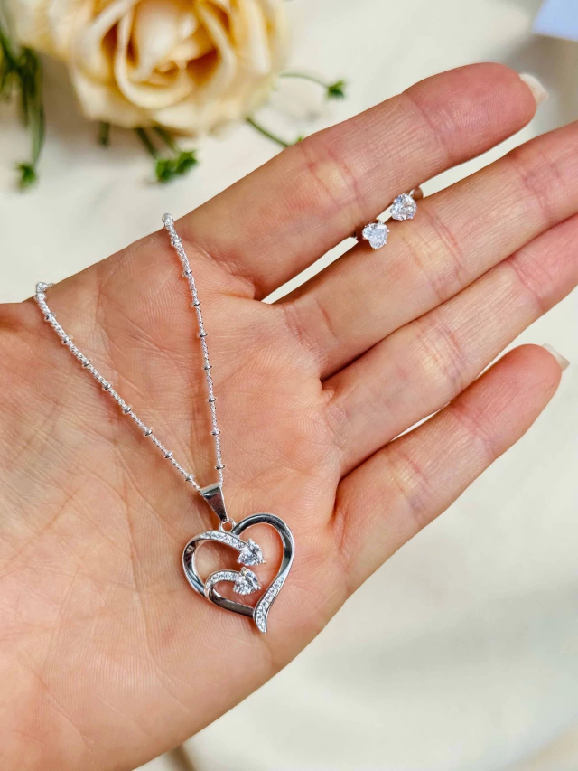 Kit Colar Bolinhas e Coração com Brinco de Zircônia Folheado a Prata 925