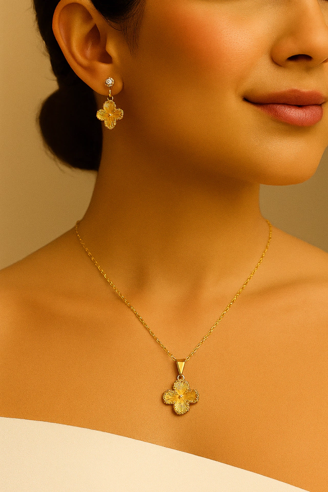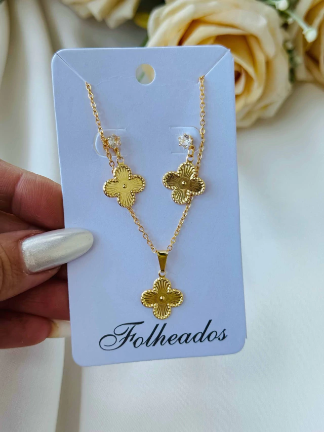 Kit Colar e Brinco Trevo Folheados a Ouro 18k