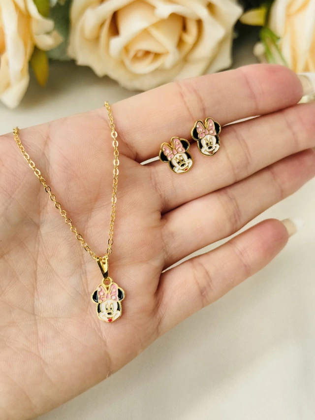 Kit Infantil Colar e Brinco Minnie Rosa Folheado a Ouro 18K