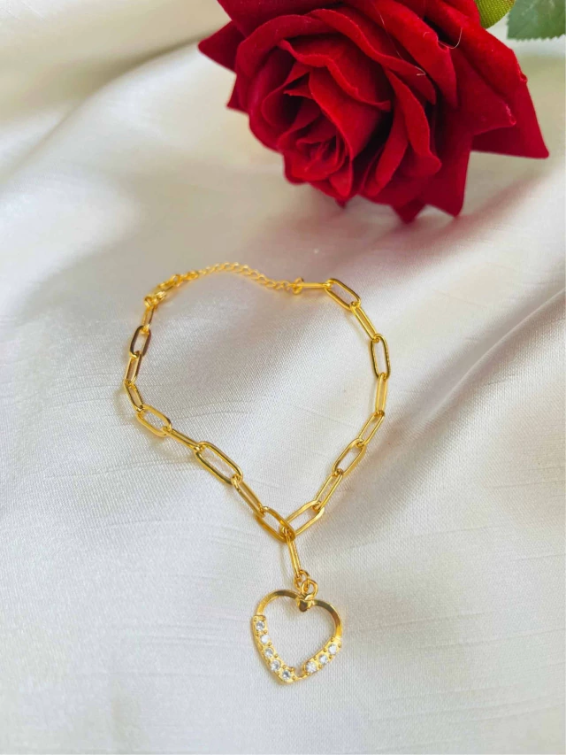 Pulseira Corrente com Coração Cravejada Folheado a Ouro 18K