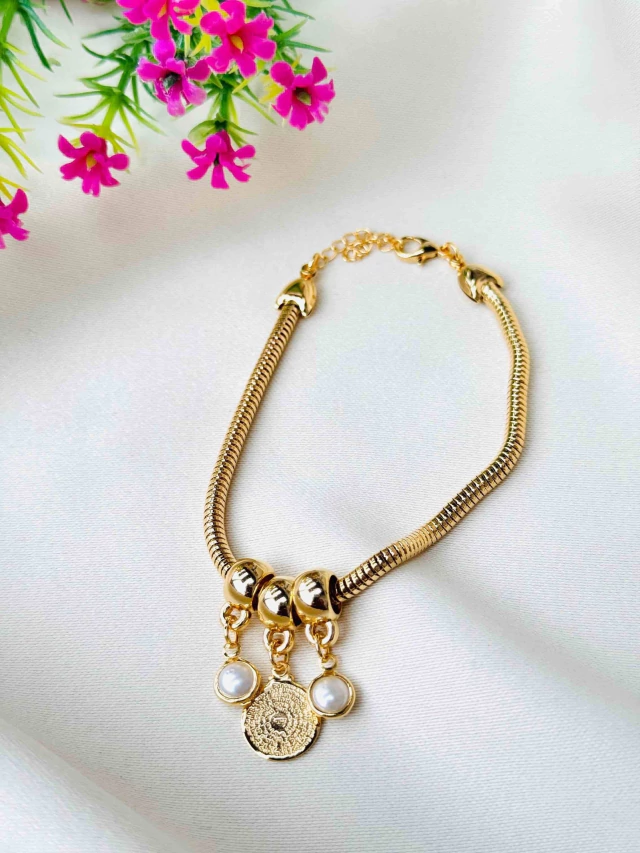 Pulseira Malha Pai Nosso e Pérola Folheado a Ouro 18k com 2 Milésimos