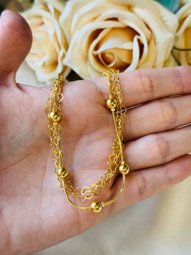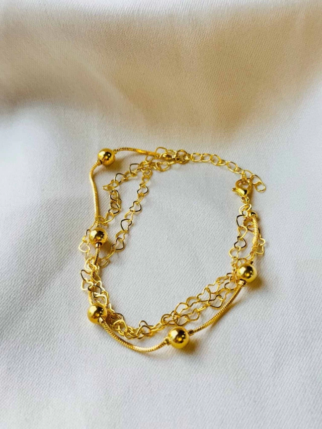 Pulseira Tripla de Coraçãozinho e Bolinha Folheado a Ouro 18K