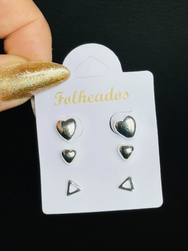 Trio de Brincos Coração e Triângulo Folheado a Prata 925